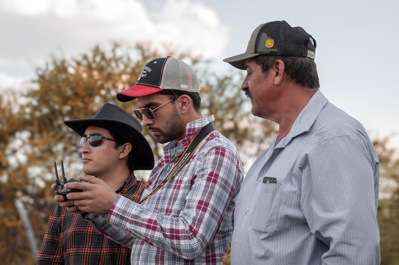 From left to right, Uriel Badillo (cofounder), Isaac Valdivia (cofounder) and Fernando Rodriguez (farmer). During a drone flight mission for topography analysis.
